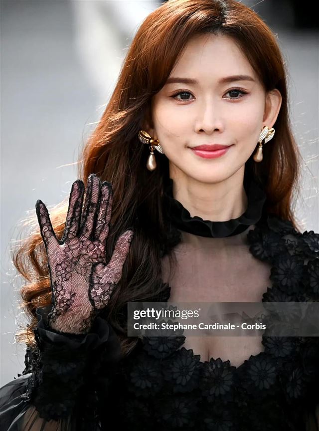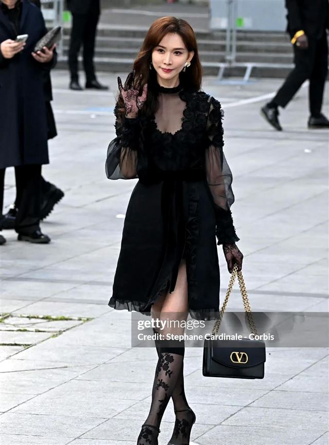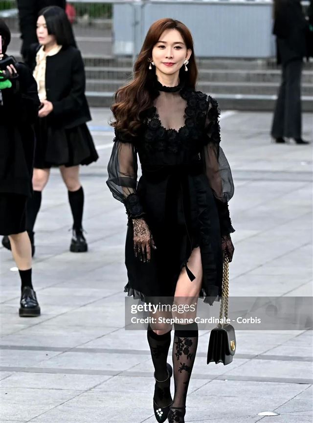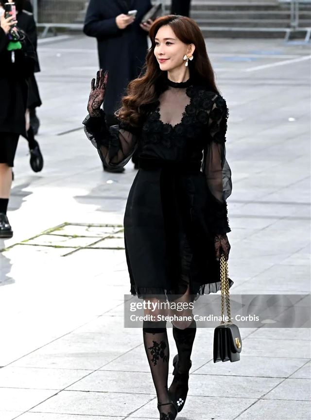林志玲出现在巴黎时装周的现场,穿了一条黑色蕾丝裙。
