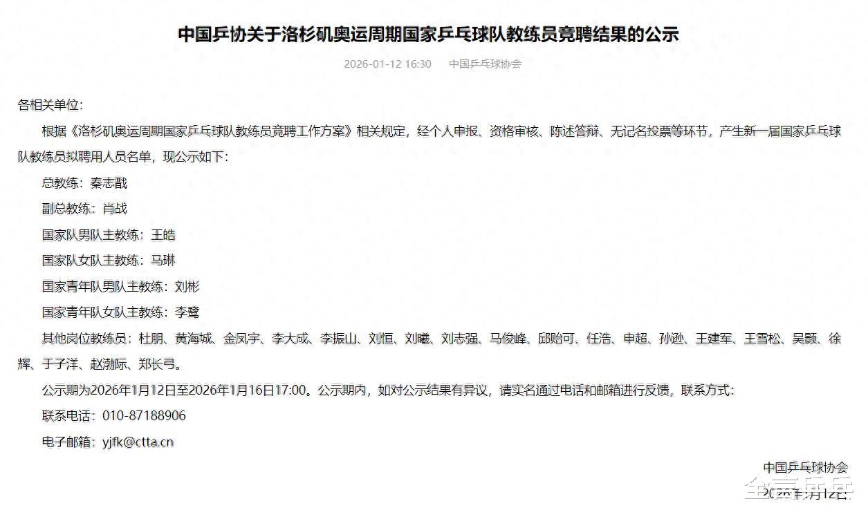 2026年1月12日,中国乒协正式公布最新一届中国乒乓球队新教练团队名单,原总教练李隼离职,改由中国乒协副主席、前男队主帅秦志戬接任;已经被取消二十余年的副总教练岗位恢复,由前混双组长肖战担任;上届男队主帅王皓、女队主帅马琳成功连任。