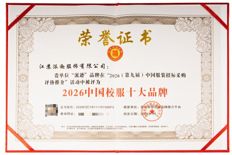 多年来,派逊连续入围“中国十大校服品牌”,被教育部授予“中国最美校服”称号,同时也是校服行业首家获得“江苏精品”认证的企业——该认证由江苏省市场监管局、发改委、工信厅等九部门联合颁发,是对企业综合实力的最高级别认定。