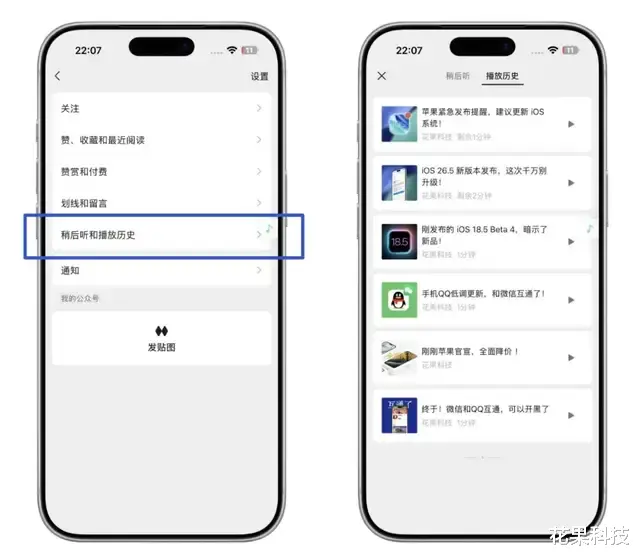 在公众号界面点击右上角头像,新增了一个「稍后听和播放历史」,可以查看和管理稍后听以及播放历史的内容。