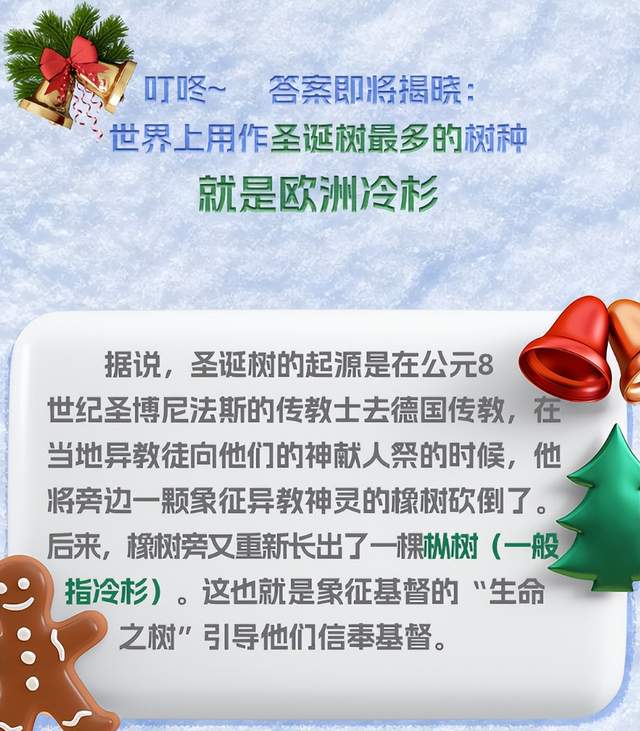 冷杉之所以被作为圣诞树,一方面是因为它耐寒且树形、颜色美丽,气味讨人喜欢,另一方面它的树枝兼备柔软和坚韧,且它的叶片即使在砍伐干燥后也不容易脱落。所以更多人喜欢用冷杉作为圣诞树来作为圣诞节的点缀。