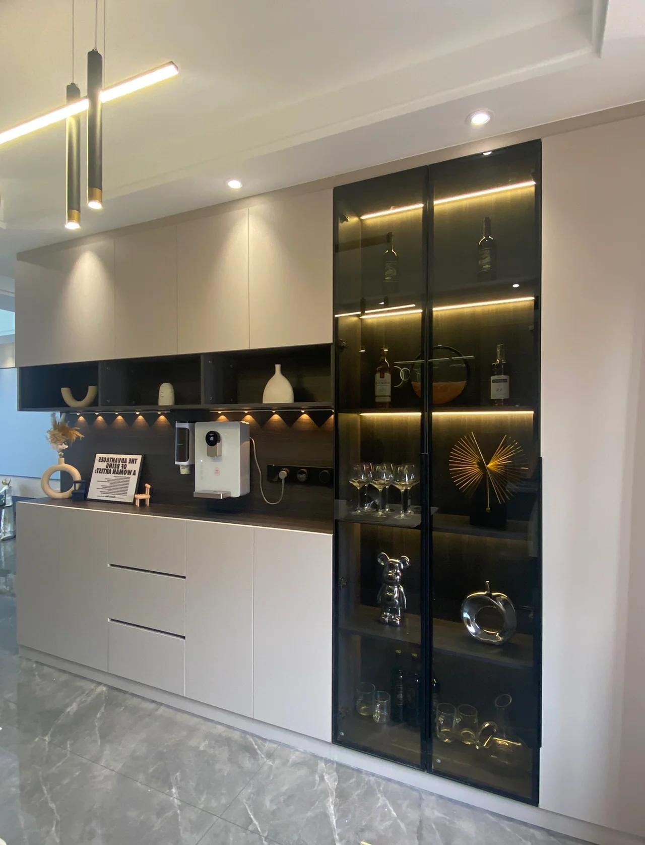 开放式设计没有遮挡,灰尘、油烟全往格子里钻,每天擦都擦不完;玻璃隔板还容易沾指纹,越擦越显脏。而且酒柜定制成本不低,占用墙面空间,不如做个封闭式收纳柜,既能藏杂物,又不用费心打理,实用性翻倍。