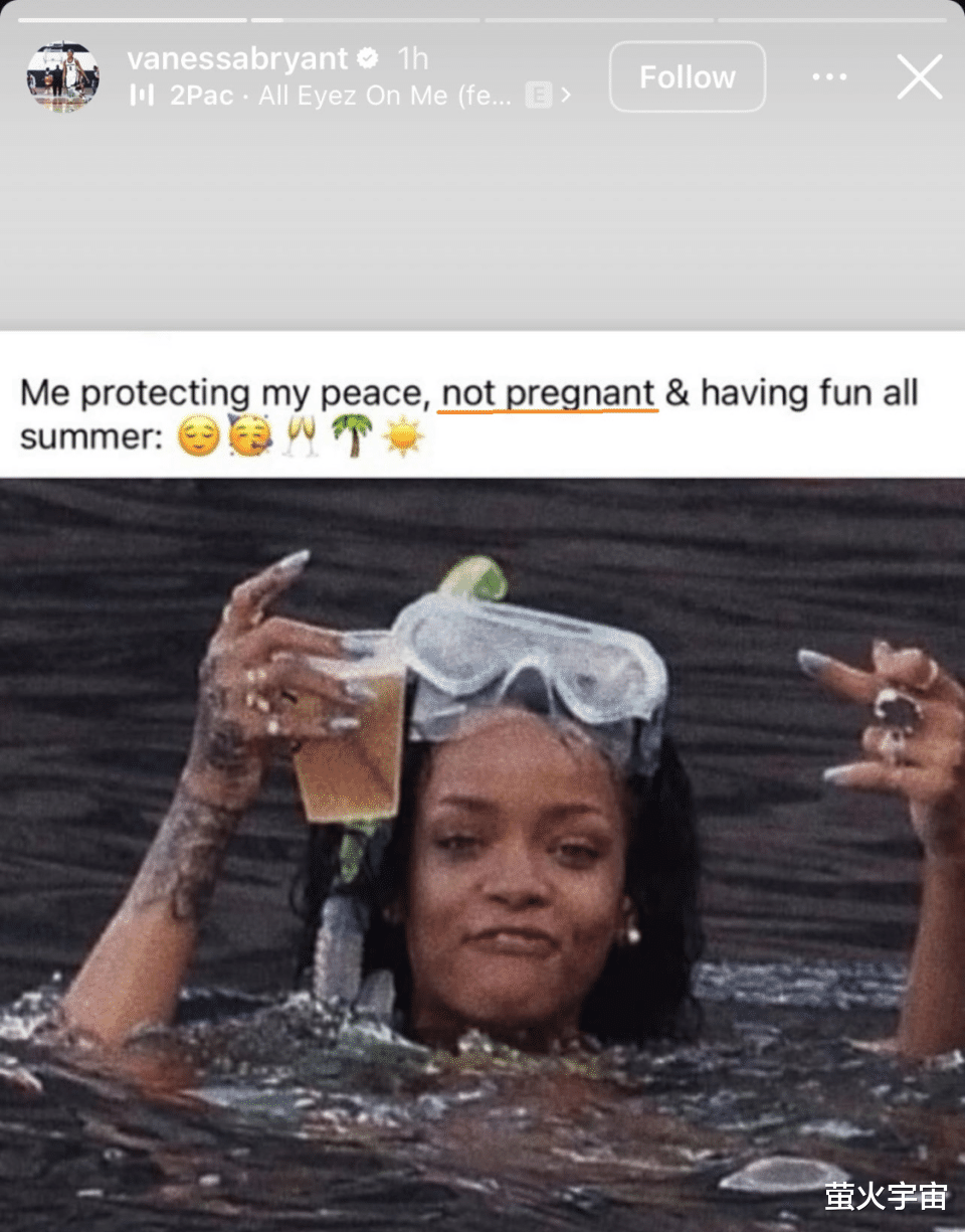 这位昔日的拉丁美女模特在社交媒体上打破了沉默,很是直接地表示“没有怀孕”。瓦妮莎配发了一张蕾哈娜在泳池中手持饮料的老照片,并配文写道:“我正在守护自己的平静,没有怀孕,整个夏天都在玩得很开心。” 同时还加上了美国说唱歌手图派克·夏库尔(Tupac Shakur )的热门歌曲《All Eyez on Me》。