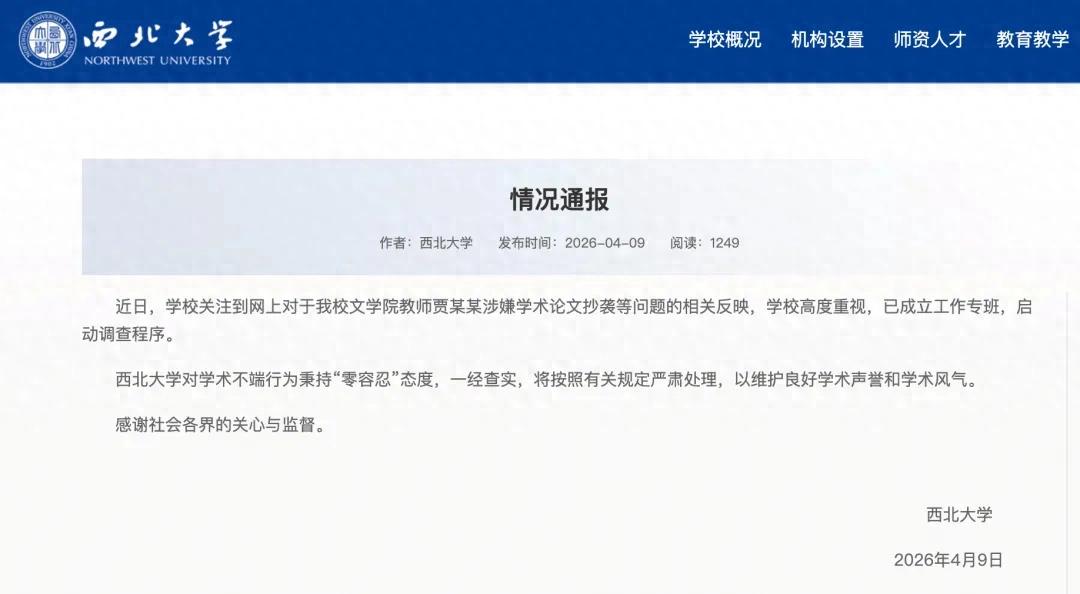 近日,学校关注到网上对于我校文学院教师贾某某涉嫌学术论文抄袭等问题的相关反映,学校高度重视,已成立工作专班,启动调查程序。