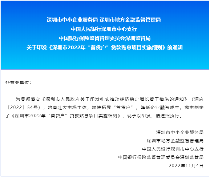 近日,深圳市中小企业服务局、深圳市地方金融监督管理局等四部门印发《深圳市2022年“首贷户”贷款贴息项目实施细则》(以下简称《细则》),对2022年6月至12月从深圳辖内商业银行首次获得贷款的企业,给予年化2%的贴息补助,单户企业贴息金额最高20万元,旨在降低企业融资成本,培育壮大市场主体。