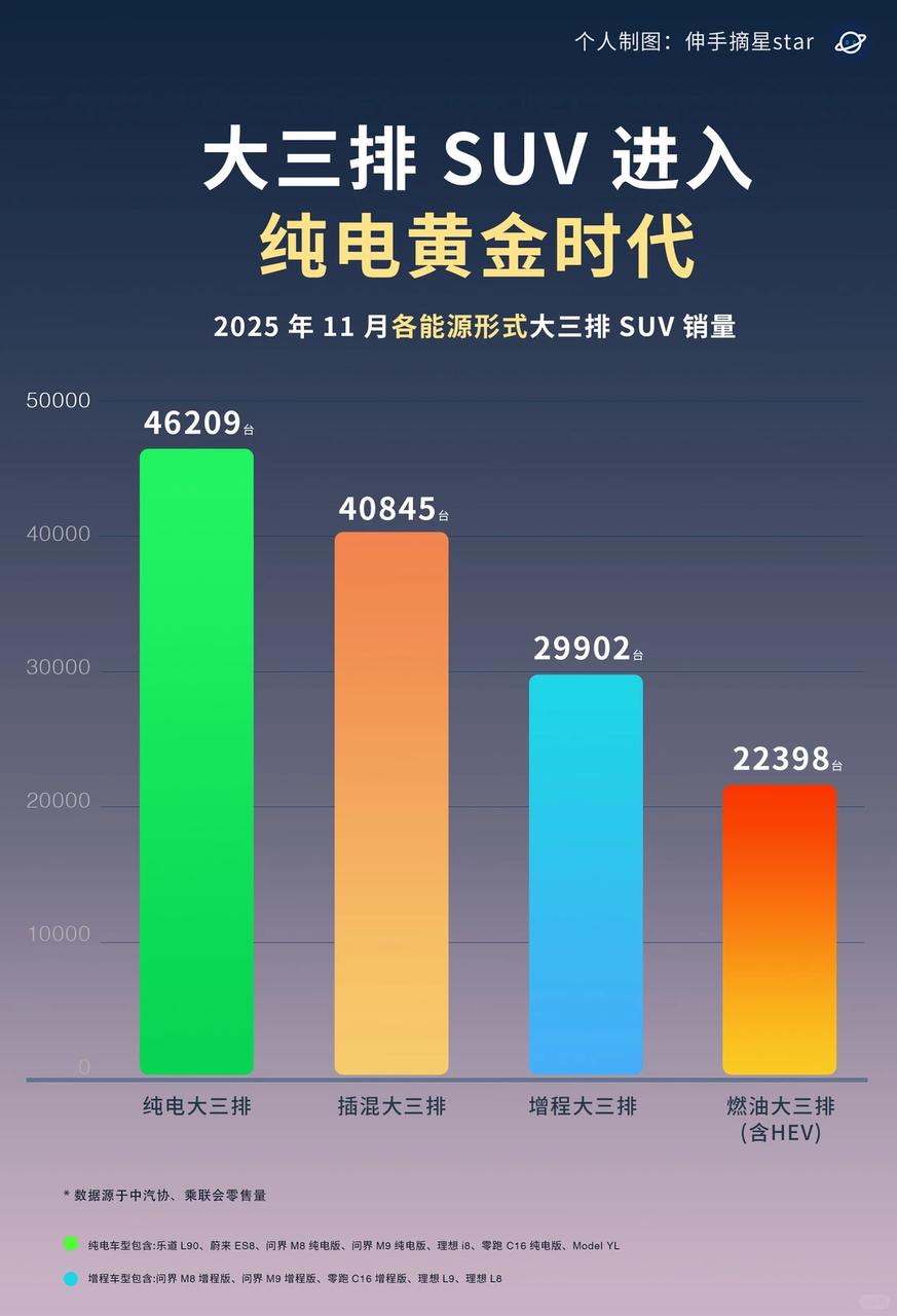 11月乘联会发布的一组数据,为新能源行业的全面转型提供了关键佐证:纯电大三排SUV销量46209台、连续三月霸榜,带动纯电市场整体同比增长9.2%;与此同时,新势力中纯电与增程的占比从57%:43%跃升至73%:27%,大三排市场的纯电渗透率更是远超行业平均水平。这一系列数据共同指向一个结论:纯电技术已完全具备替代燃油、增程等传统动力的能力,而大三排SUV市场的全面纯电化,正是这一替代进程的核心信号。