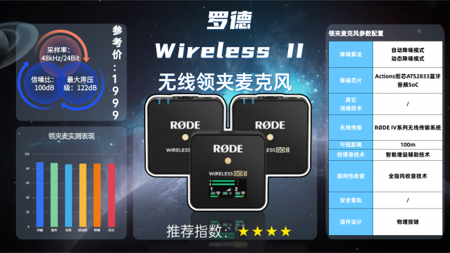 2.产品采用2.4G私有协议,100米无障碍传输稳定,支持48kHz/16bit采样,一拖二设计可满足双人录制,内置本地录音功能,最长可录制14小时无损音频,支持安全音轨备份。