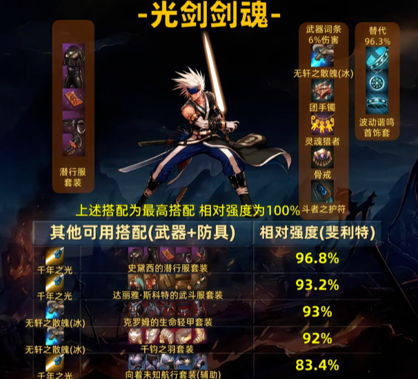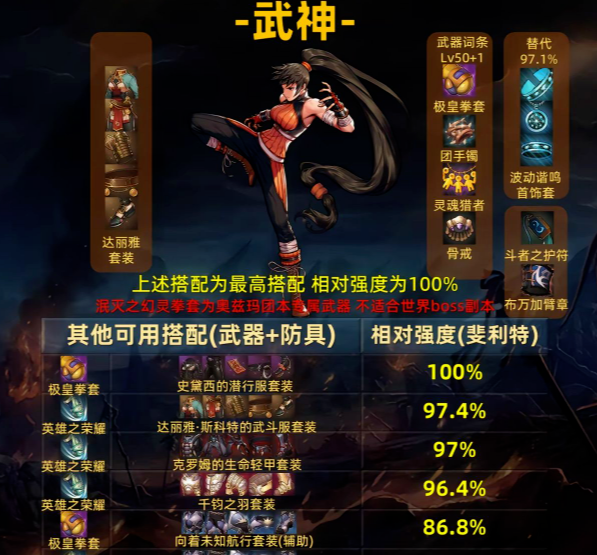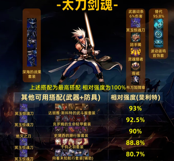 最强搭配为“深海套”(防具)+“团魂骨”(首饰)+“冥刀”(武器)+“布万加”(辅助装备),在提升率方面问鼎榜首!