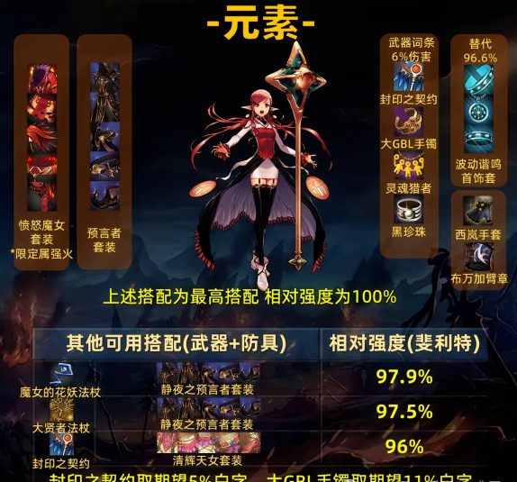 愤怒魔女(限定火强)或预言者套+封印之契约武器+大GBL手镯+灵魂猎者+黑珍珠,伤害强度最高!