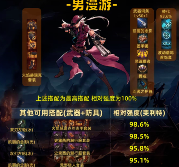 “火焰赫瑞克套”+“团魂骨”+“凯丽的念影”左轮+“斗者之护符”,强度在这个职业中位列第一。
