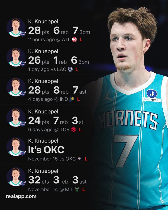 黄蜂这边,在三球和米勒双双缺阵的情况下,也有3人得分20+。新秀克尼佩尔表现出色,出场34分钟,投篮17中9,三分球11中7,罚球3中3,空砍28分6篮板3助攻1盖帽的数据。过去4场比赛,克尼佩尔都得到至少24分,场均可以得到26.5分5.5板3助攻。克尼佩尔本赛季场均也能得到19.4分5.8篮板2.9助攻,能命中3.7记三分,投篮命中率49%,三分命中率44%,罚球命中率90%,是最佳新秀的热门人选。