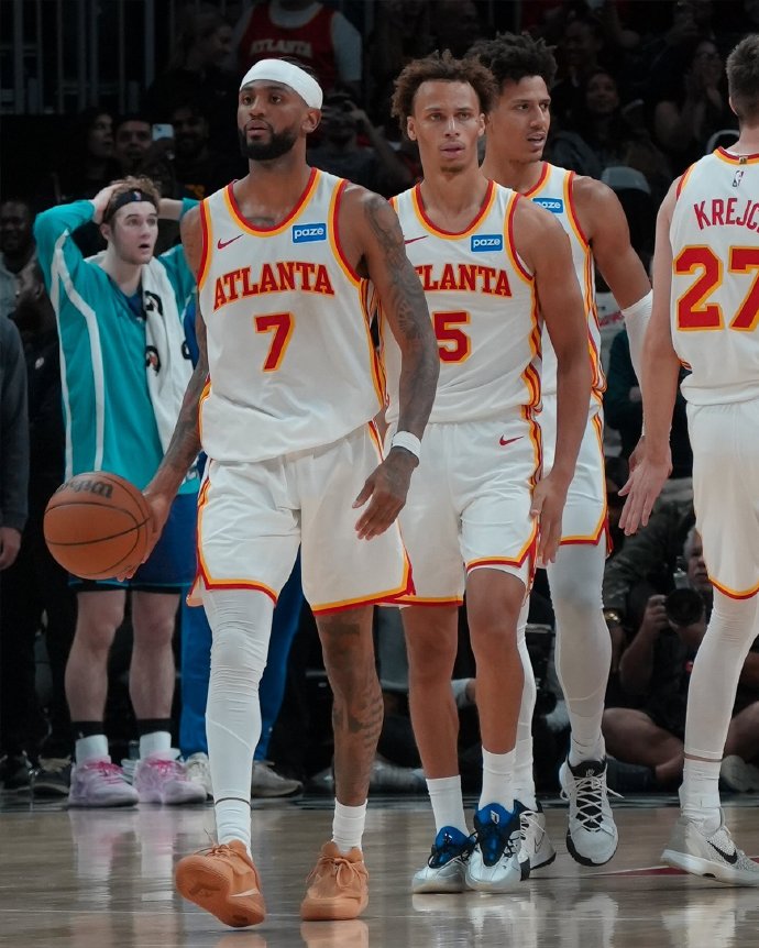 老鹰今天有4位球员砍下20+,杰伦·约翰逊十分高效全面,出场40分钟,投篮22中11,三分球4中2,罚球5中4,砍下28分8篮板11助攻1抢断的准三双数据。过去7场比赛,杰伦·约翰逊表都非常给力,场均能够拿下25.5分11.2篮板9.5助攻2.3抢断,投篮命中率52.9%,三分命中率达到了55.6%。