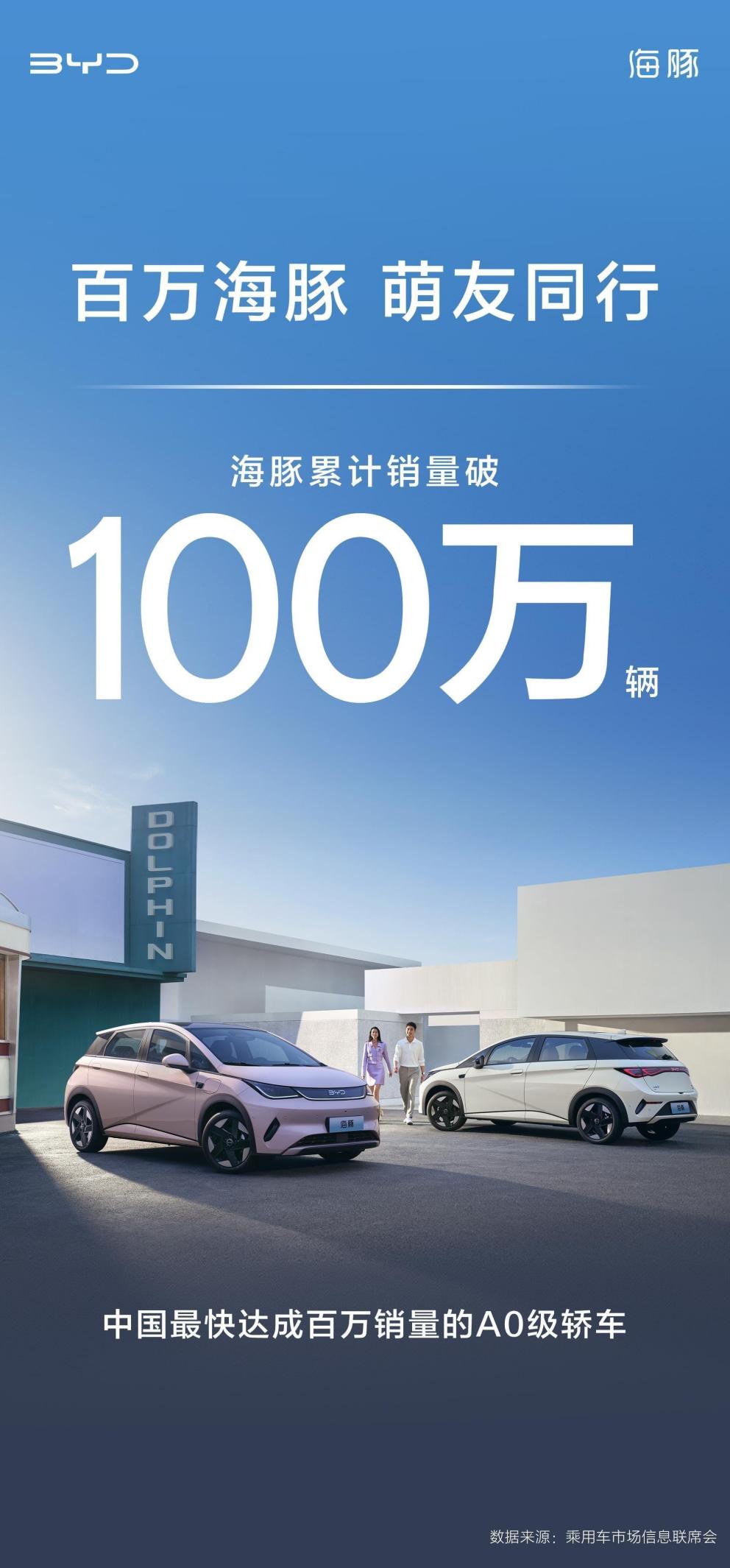 历经四年的市场检验,海豚销量突破100万辆,为A0级轿车市场向上发展注入更多积极能量,持续助推细分市场向精品化、高质量阶段迈进。百万用户的优秀口碑,再次印证了海豚的出色产品力和可靠品质。未来,海豚将以用户需求为导向持续迭代,为更多萌友打造更美好出行体验。