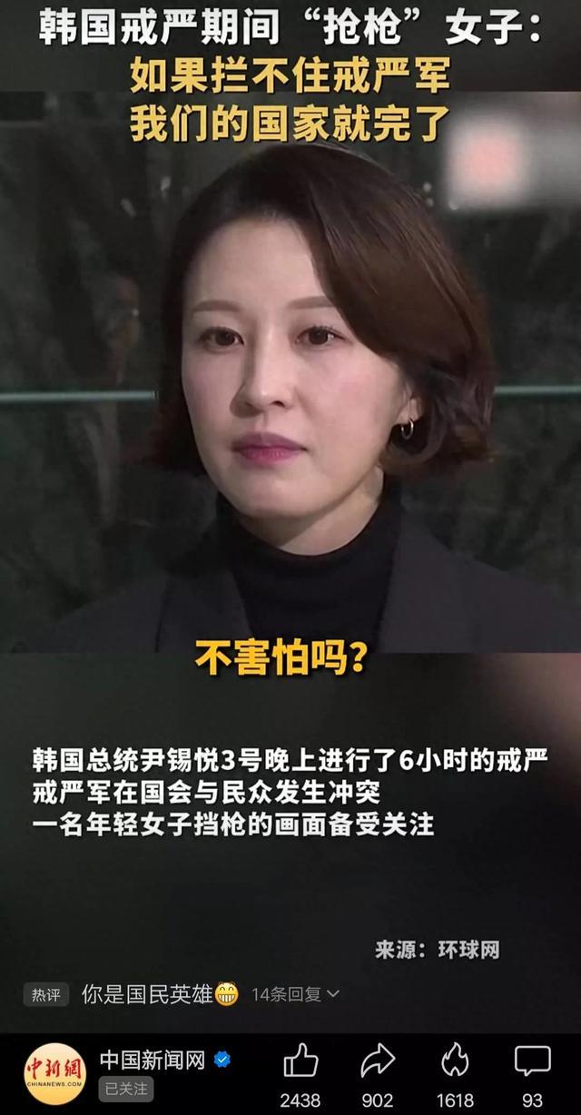 有没有发现,如果他是男的,估计都没胆量,在那种场合去面对荷枪实弹的戒严军,但是这个女子做到了,那是韩国政党的争端,在冲突爆发时!她冲在最前面,正因为是个弱女子,也估计当时,那个戒严军也没有真会开枪!只不过局势动乱,气氛非常紧张,所以!出现了镜头里,有勇气和戒严军抢枪的场景!