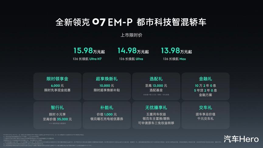 全新有为,极智新境。9月25日,都市科技智混轿车——全新领克07 EM-P正式上市。新车共推出126长续航Max、126长续航Ultra、126长续航Ultra H7三款配置版本,上市限时价13.98万元起。同时,全新领克07 EM-P还准备了限时领享金、超享焕新礼、选配礼、金融礼、智行礼、补能礼、无忧臻享礼、交车礼在内的8重限时福利。