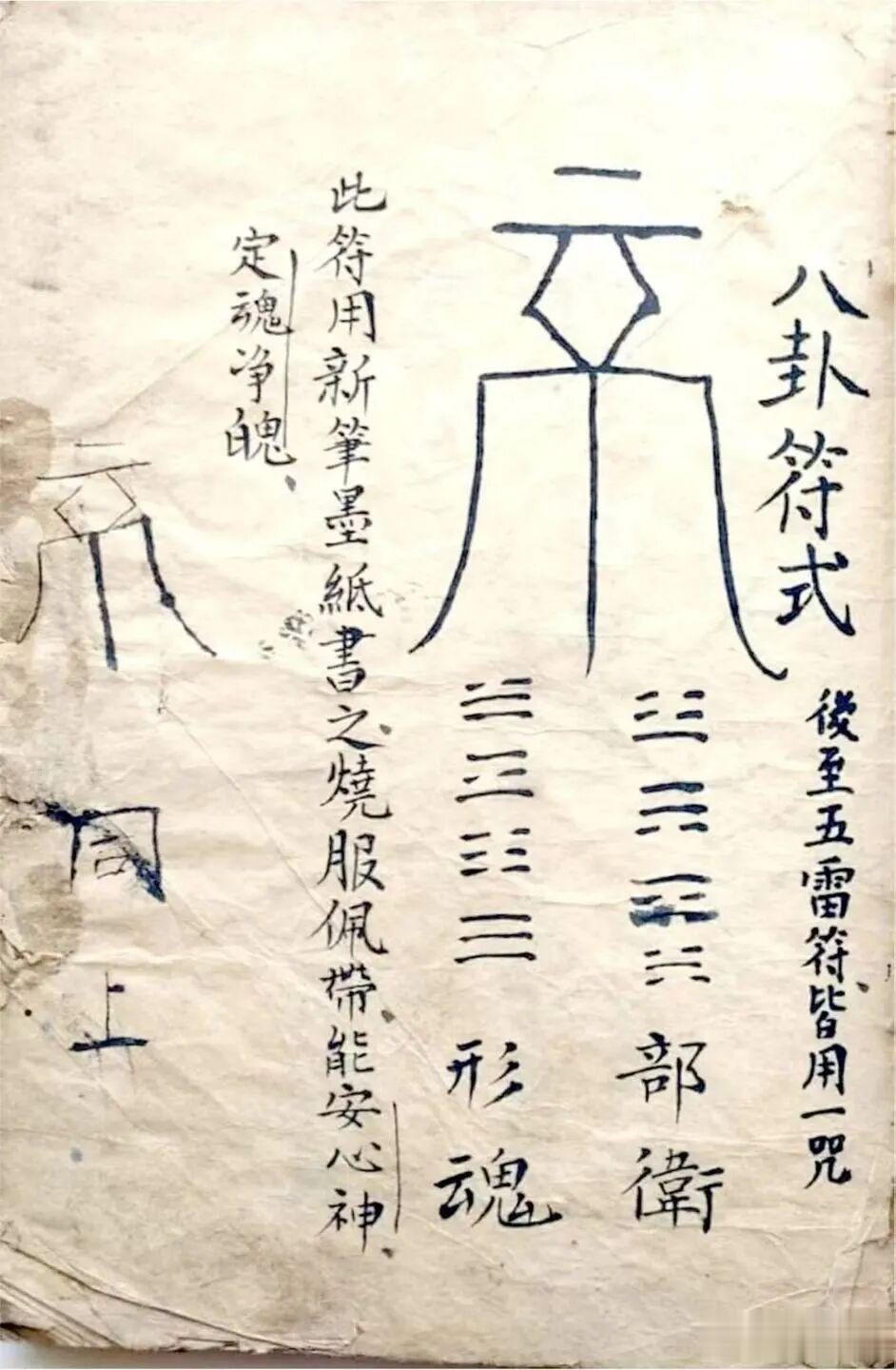 道家茅山秘术古籍《茅山巫术》页数_42筒子页84单页简介_《茅山巫术》道家茅山秘术相关古籍内容:八卦符式安心神定魂净、辟邪驱病(凡人有病或怪邪朱砂书符佩身百病皆远遁)治心疼,辟邪驱病,目病,大小便不通,心气冷疼,小儿痘珍,盼亲人归,安宅,水食气不消肚胀疼,除邪、镇邪,五雷除邪镇邪等诸符式及用法并纸、笔、墨咒语,