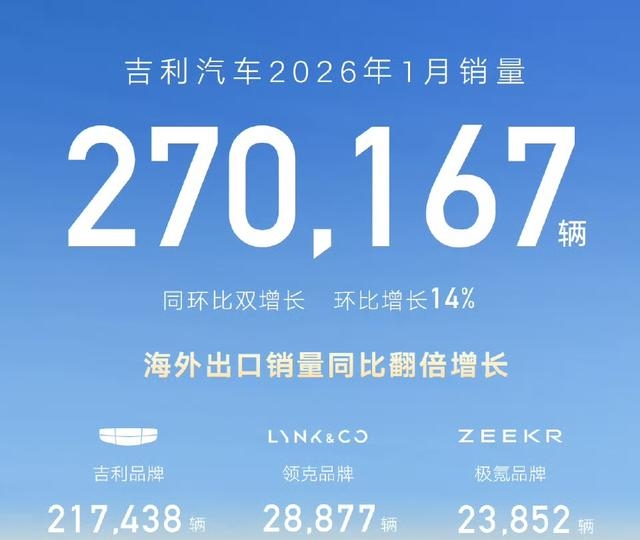 吉利这27万辆,说实话,不是那种炸裂的“车界网红式”爆量,但可贵在一个“稳”字。环比12月还涨了14,对很多品牌是淡季,对它更像是正常发挥。新能源卖了12.4万辆,占比46,算是半条腿已经踏进电动化主战场,而且海外出口60506辆,同比翻一倍多,这个体量在传统车企里非常有排面,走路完全可以摇头晃脑那种。