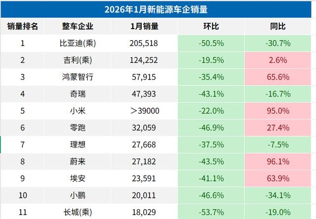 谁能想到,新年刚开局,被喊了多年“国民神车厂”的比亚迪,居然成了这波销量榜里跌得最狠的那个,一月卖了21万辆,同比直接砍掉三成多,真有点把老车主气得蹦起来的味道。而另一边,吉利悄无声息干到27万辆夺冠,小米、鸿蒙智行一路狂飙,车圈的牌位,开始松动了。