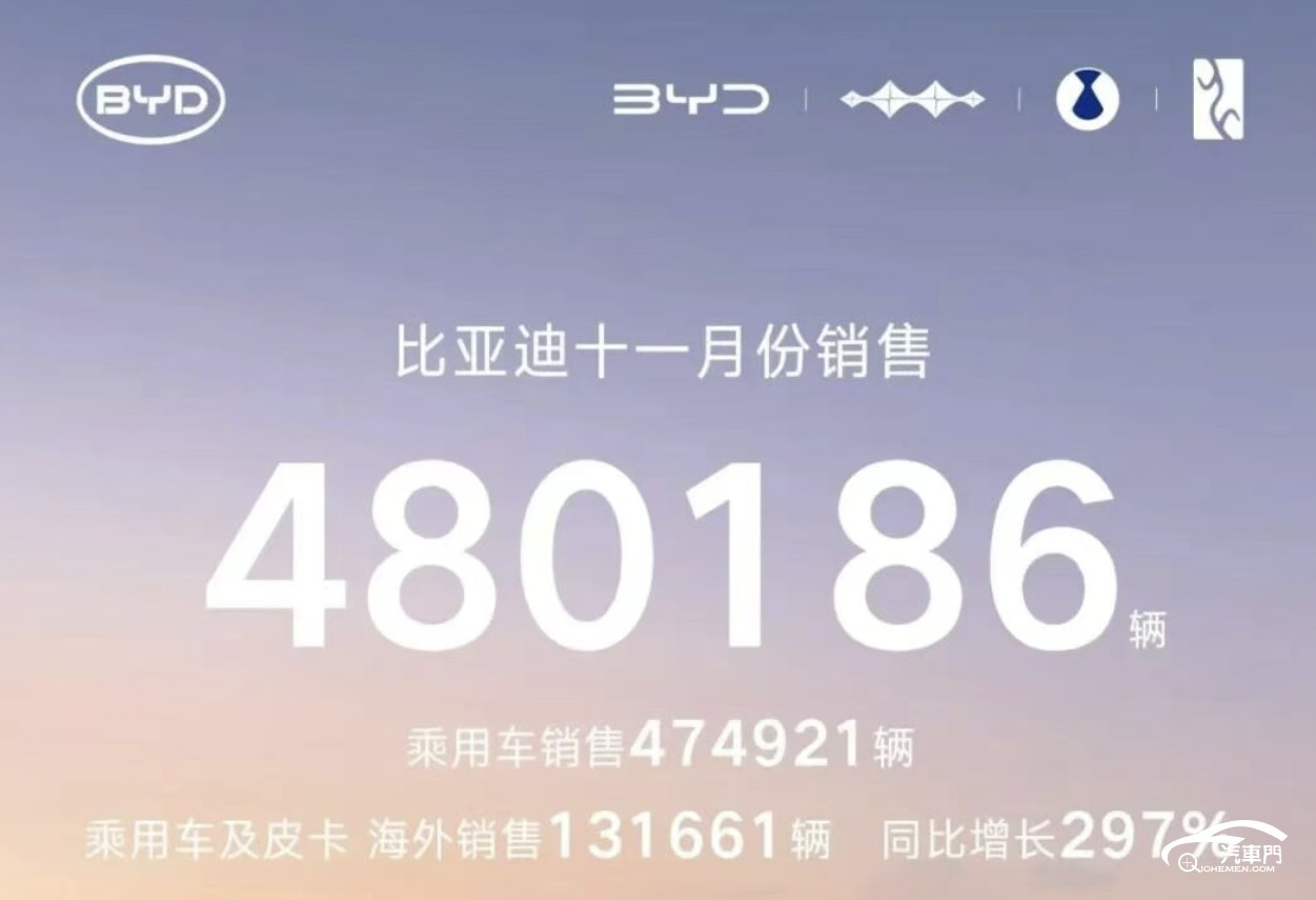 11月,比亚迪以绝对优势再度登上销量榜首。数据显示:比亚迪11月共售出了480186辆,环比增长了9%。