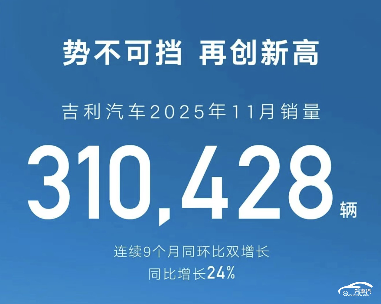 与比亚迪相比,吉利则交出了一份含金量十足的成绩单。数据显示:11月吉利共卖出了310428辆,同比增长了24%,创下历史新高。