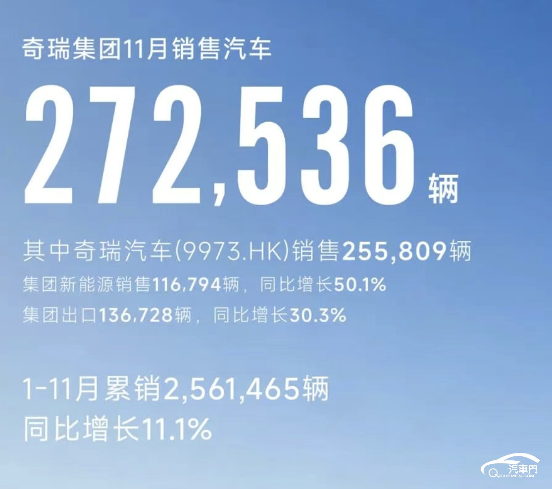 最近一段时间,奇瑞集团在新能源和出口方面表现尤为亮眼。数据显示:11月,奇瑞集团共卖出了272536辆。
