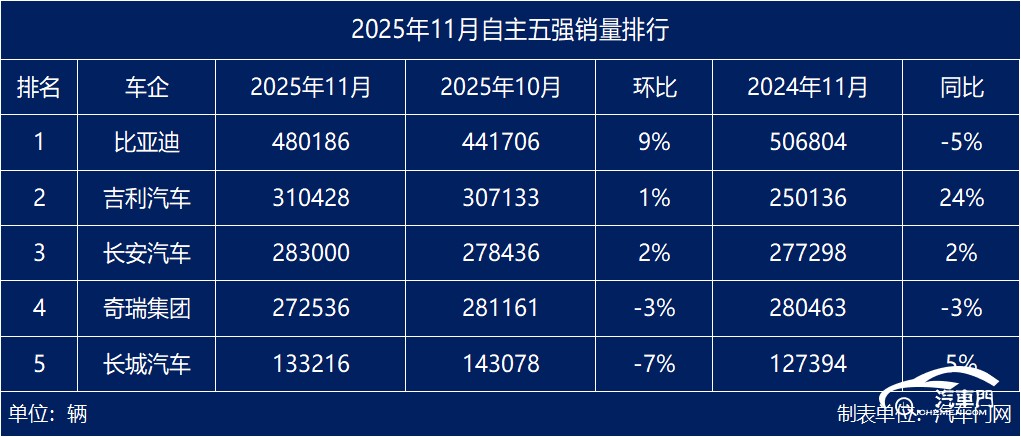 那家又增了两成,11月自主五强销量盘点