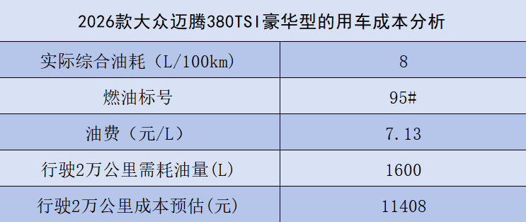 2026款大众迈腾B8提供1.4T和2.0T两种动力系统,与之匹配的变速箱均为7DCT,对应的最大输出功率分别为110kW和162kW。大部分用户在购车时更倾向于选择2.0T车型,所以今天也以迈腾2.0T车型为例进行分析。新车的WLTC百公里综合油耗为6.72L,该款车的用车成本在大部分人的接受范围之内。不过由于不同消费者的驾驶里程和用车习惯不同,实际油耗与官方数据略有出入,根据车友圈的朋友讲述来看,该款车在市区通勤油耗为10L左右,高速稳定120km/h巡航,表显油耗为6L/100km,如果按一年2万公里为例进行计算,城区和高速各占一半,那么它的实际油耗大约8L/100km。