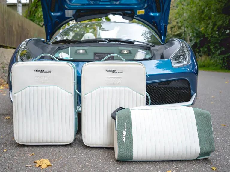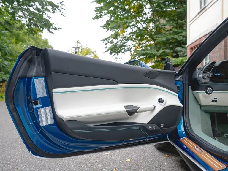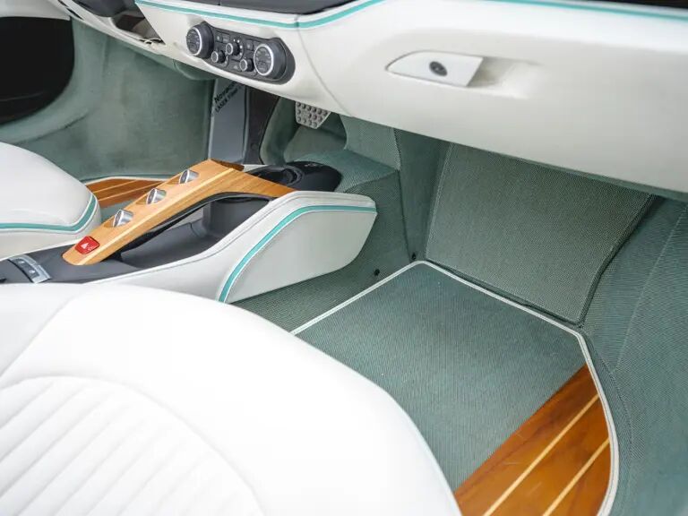 内饰更是将海洋奢华氛围推向极致,大面积白色真皮包裹座舱,辅以蒂芙尼蓝色缝线,头枕位置手工刺绣跃马徽标,中控台、门板、侧裙以及地板区域均大面积使用意大利枫木与胡桃木镶嵌,纹理细腻如游艇甲板,搭配Kvadrat高端海洋专用地毯,从触感、视觉到氛围都高度复刻Riva游艇的奢华体验,后备箱内还配备全套同主题定制行李箱、工具包与充气设备,整套设计浑然一体,没有任何违和之处。