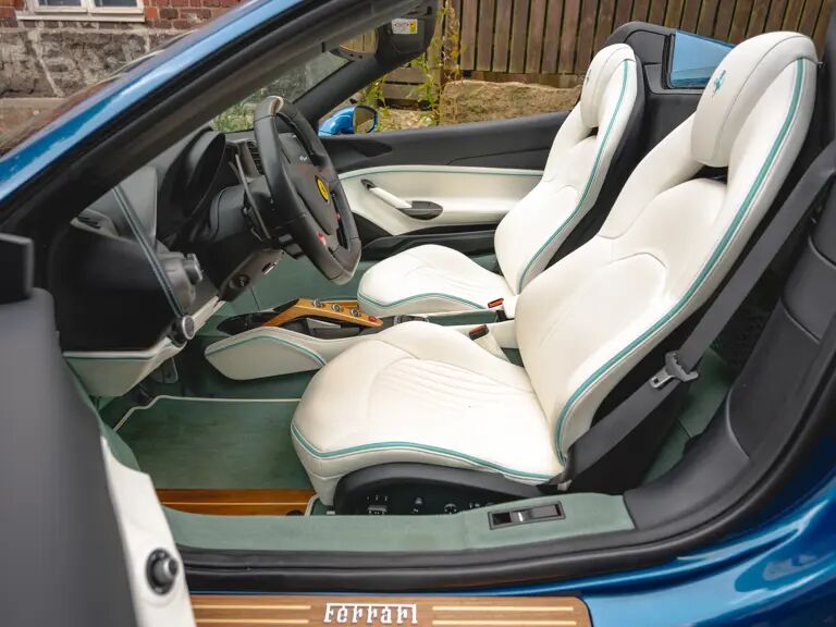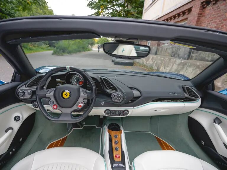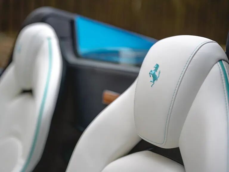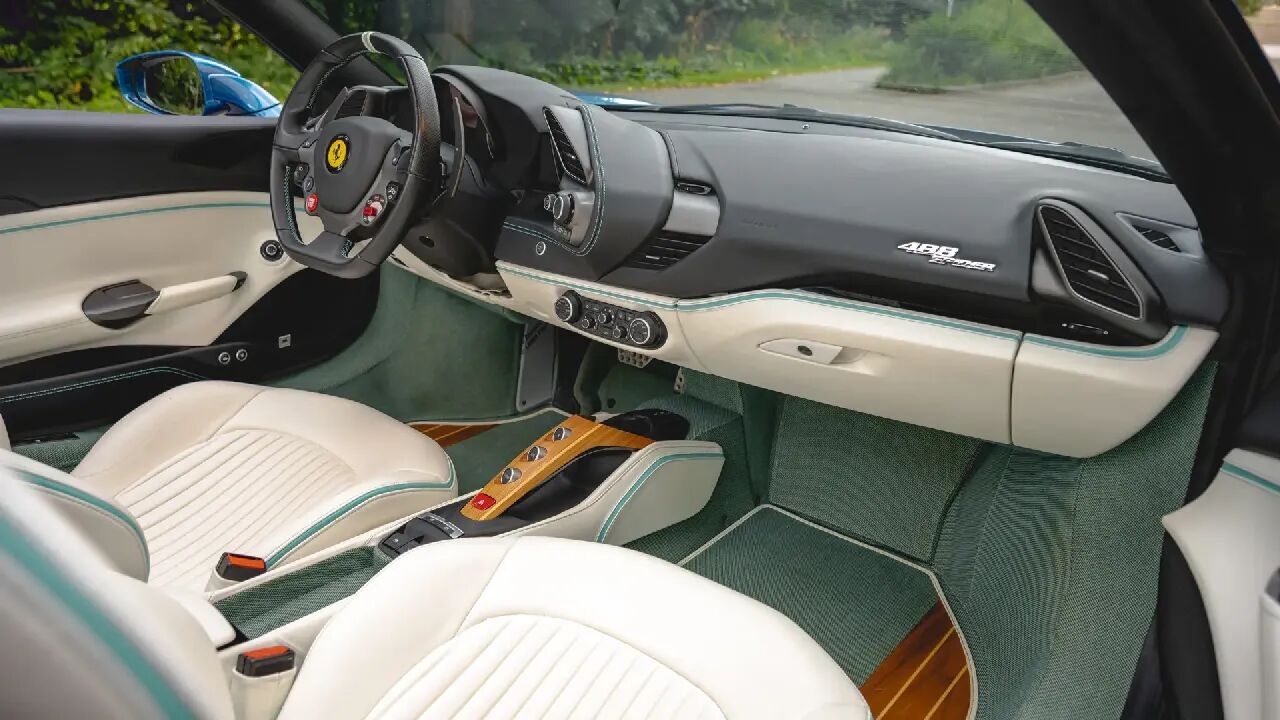 这台488 Spider从诞生之初便只为一位车主专属打造,全车深度定制,并非普通选装可比,外观采用极具海洋气息的Blu Chiaro Metallizzato金属浅蓝为主色调,搭配Bianco King象牙白与Blu Tiffany蒂芙尼蓝作为下包围点缀,20英寸锻造钻石合金轮圈使用同色系蓝色轮毂盖与镀铬跃马徽标,每一处色彩搭配都直接取材于Riva经典游艇的经典配色,光影之下如同波光粼粼的亚得里亚海面,优雅而富有层次。