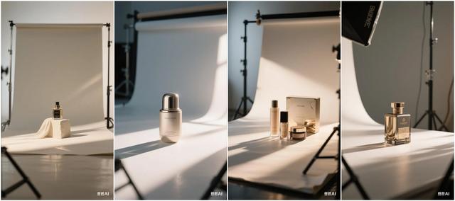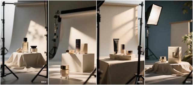 下面两组商品拍摄广告图片,只输入“摄影棚里面拍商品广告的场景”的文字,大约十几秒钟就生成4张场景图片。