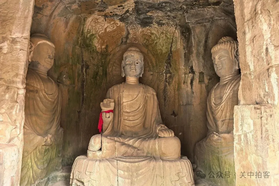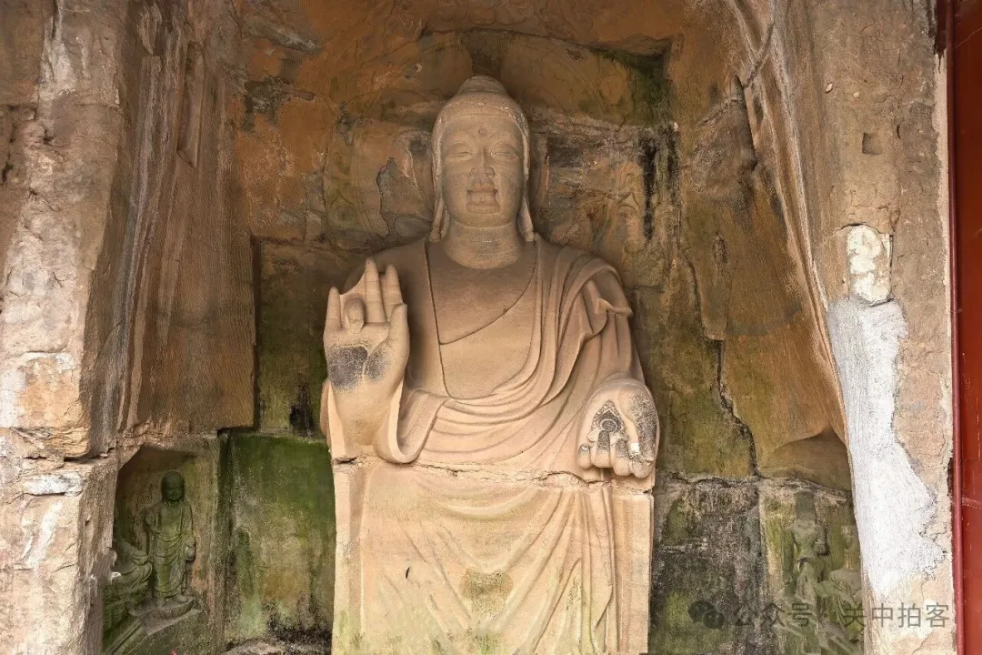 在西区和中区内,零星分布着两三个佛龛;在尽头的东区内,集中分布着五个佛龛,垂直排列,共有三层。其中,最上方的佛龛较大,高浮雕一佛二菩萨,正中间的主尊佛像高2.3米,左手放于膝盖,右手施无畏印。