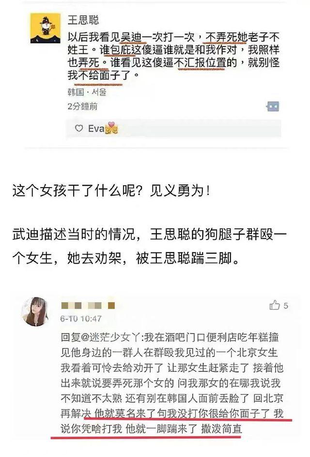 2016年,王思聪在韩国群殴一名北京女生,因为有中国女孩吴迪上前制止,王思聪等人更是对该女子出手,并声称见一次打一次,不打吴迪不姓王!