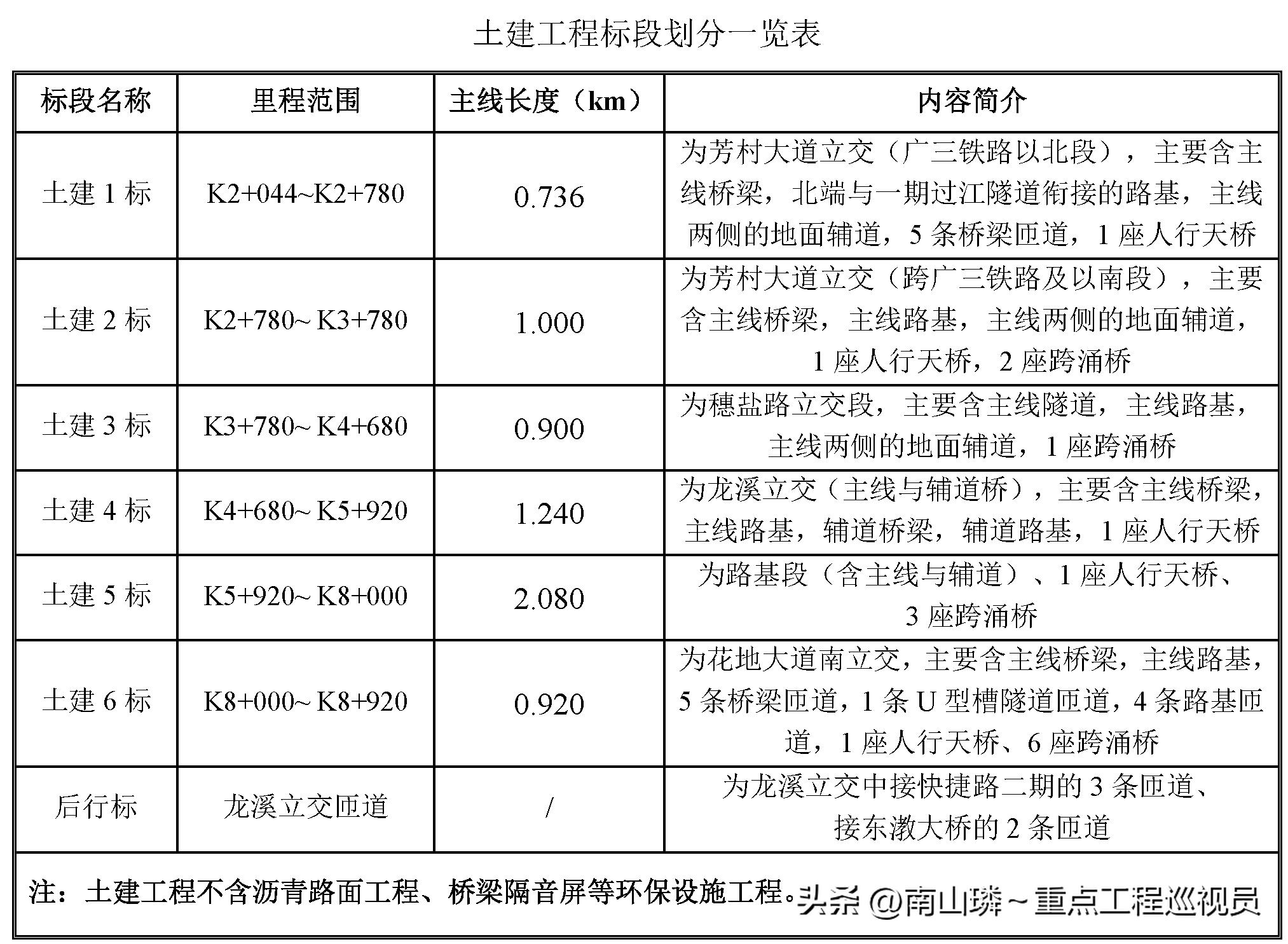 本工程土建工程包括道路工程、桥梁工程、隧道工程、排水工程、电力管沟工程、交通疏解及临时工程,共分成7 个标段,具体划分如下: