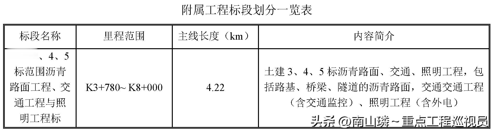 本工程附属工程包括土建3、4、5 标范围沥青路面工程、交通工程与照明工程,共分为1 个标段,具体划分如下: