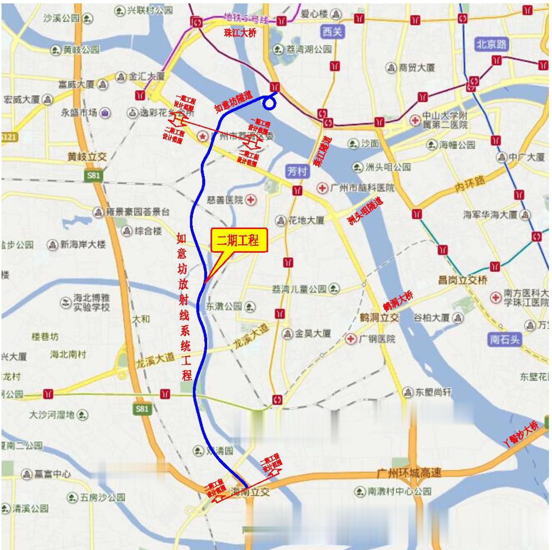 根据《广州市中心区交通项目领导小组办公室关于如意坊放射线系统工程(二期)项目移交会议的纪要》穗中交纪要[2017]34 号文,明确如意坊放射线系统工程一期、二期的分界面为芳村大道,一期工程主要实施如意坊立交、如意坊过江隧道及隧道连接芳村大道的地面道路,二期工程主要实施芳村大道以南路段,芳村大道立交系统属二期工程范围。