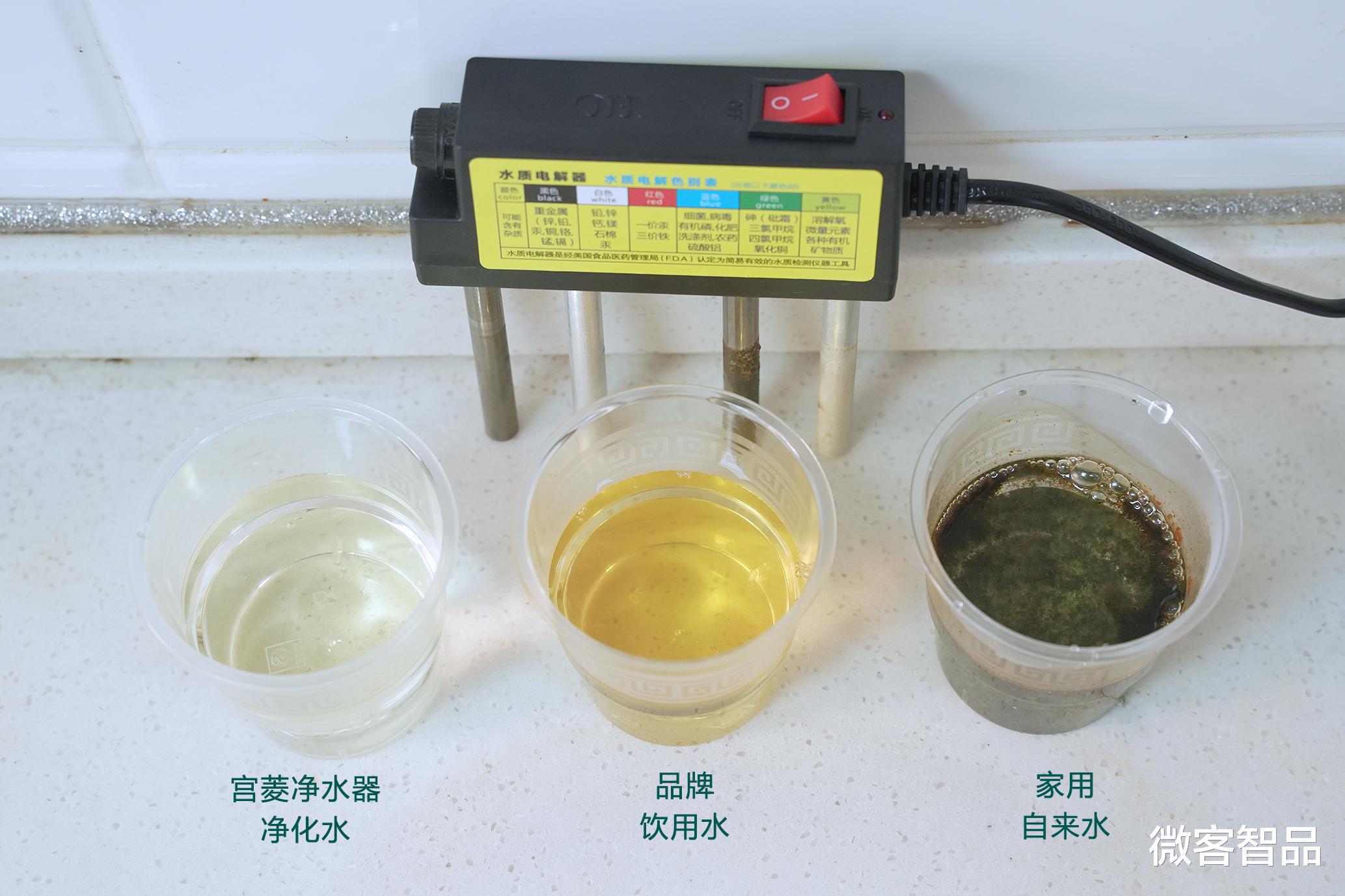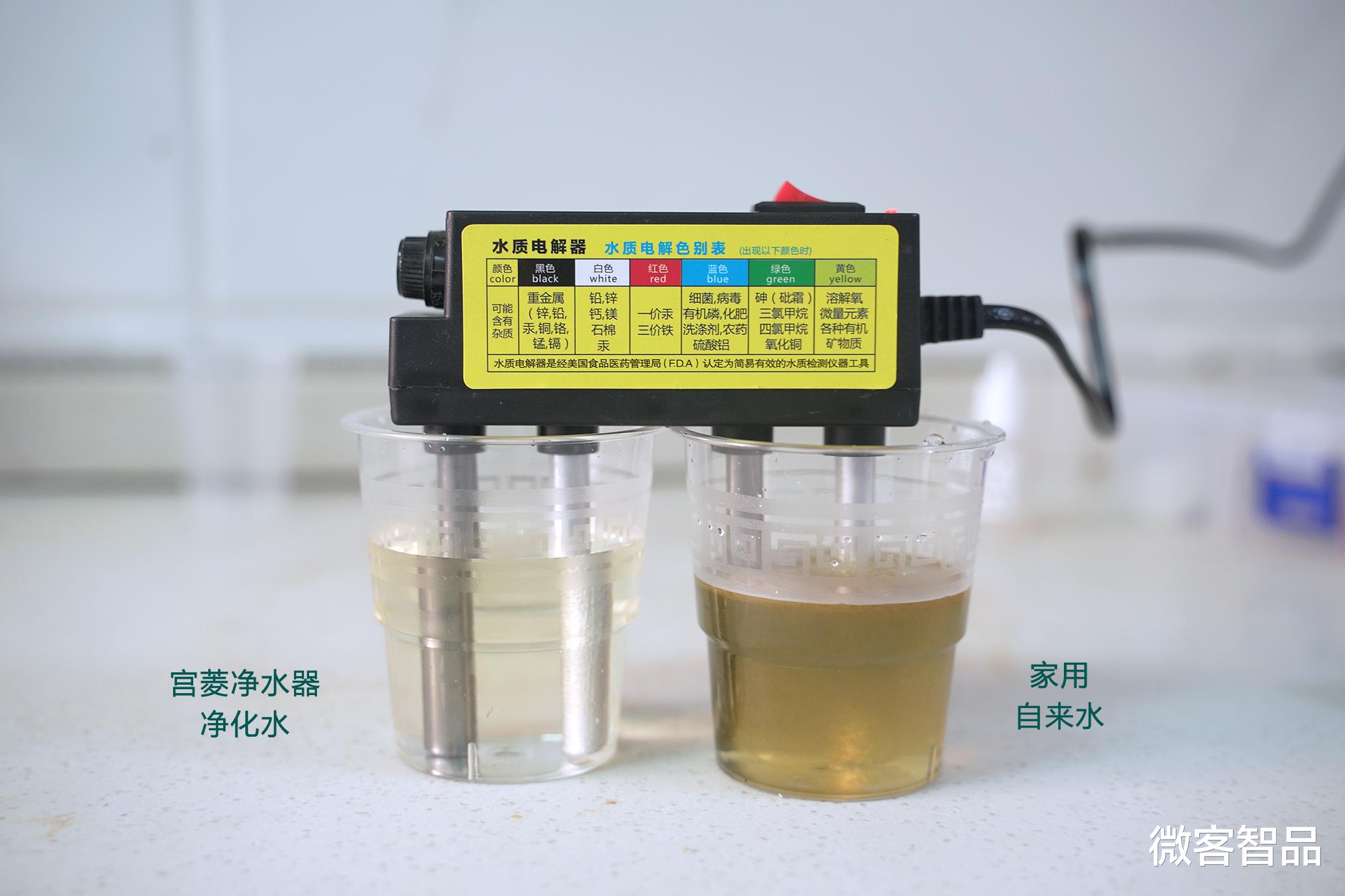 再通过电解设备进行水质电解,通过观察,自来水电解后产生了明显的红褐色沉淀(铁锈+重金属),而经过宫菱净水器净化的水仅有微小变化。这主要是宫菱有着0.0001微米的超细精度RO滤芯+16层RO膜、双向SCC正反冲过滤+双通路循环过滤、特殊的椰壳烧积碳净化等独家黑科技,针对重金属离子(铅、镉)进行电荷吸附,做到了99%的脱盐率和消杀200种细菌过敏原,将净化技术做到了极致。
