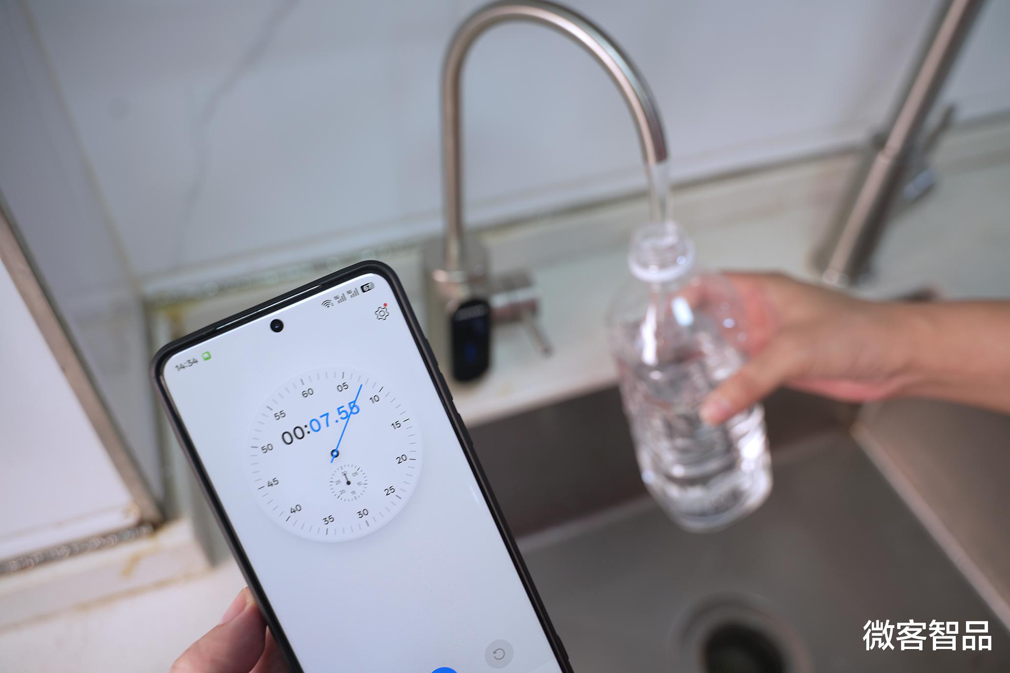 得益于超长加宽杜邦双通路长效RO反渗透膜,以及特制螺旋式过滤循环水路设计,通量可达1200G的宫菱净水器,3.7L/min高流速接满500ml仅需7秒左右,洗菜、接水无需更多等待。