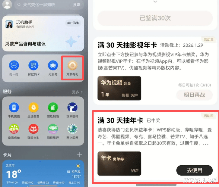 本来都要下手充会员了,突然灵光一闪:我之前把手机系统升级到HarmonyOS 6的时候,不是参加了“鸿蒙有礼”活动吗?记得规则里说,首次签到后第30天,就能抽“热门应用年卡免单券”。赶紧上去看看,哎,刚好够资格了,赶紧抽一个试试,正好手气爆棚,中奖提示秒弹出来,快乐来得太突然!大家别急着羡慕,只要手机升级到HarmonyOS 5.1及以上版本,桌面右滑进入负一屏,点开“鸿蒙有礼”,就可以签到参加活动啦。悄悄说下活动规则,每天有1次机会,最多能抽10次。所以,如果你参加的话,开始没中奖的话也别慌,多抽几次说不定就欧气附体啦~
