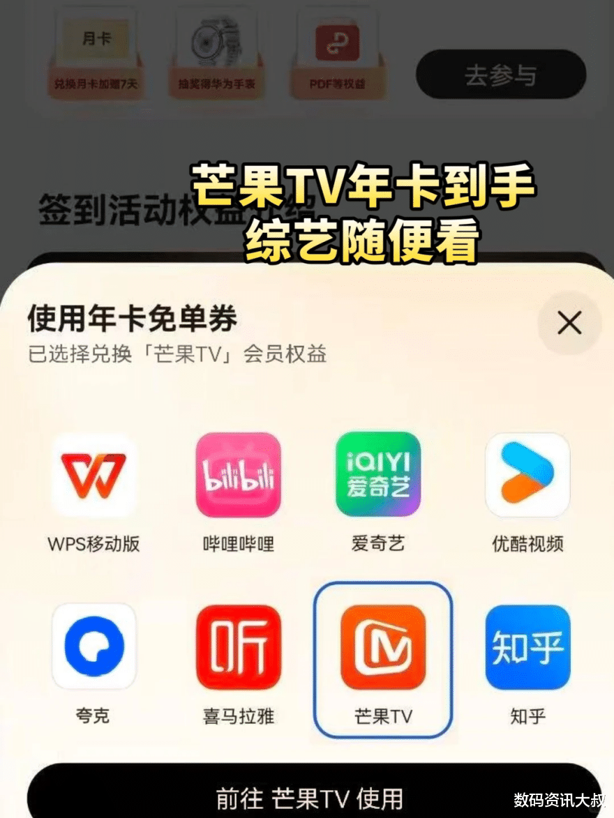 这个年卡也太香了,能在芒果TV、优酷、喜马拉雅、B站、WPS等8个热门应用中任选一个兑换。我毫不犹豫就兑换了芒果TV,不仅可以接着追《向往8》。更绝的是芒果的《声生不息华流季》《声名远扬》等热门综艺都可以爽看了,这些以后都是我的专属电子榨菜了。