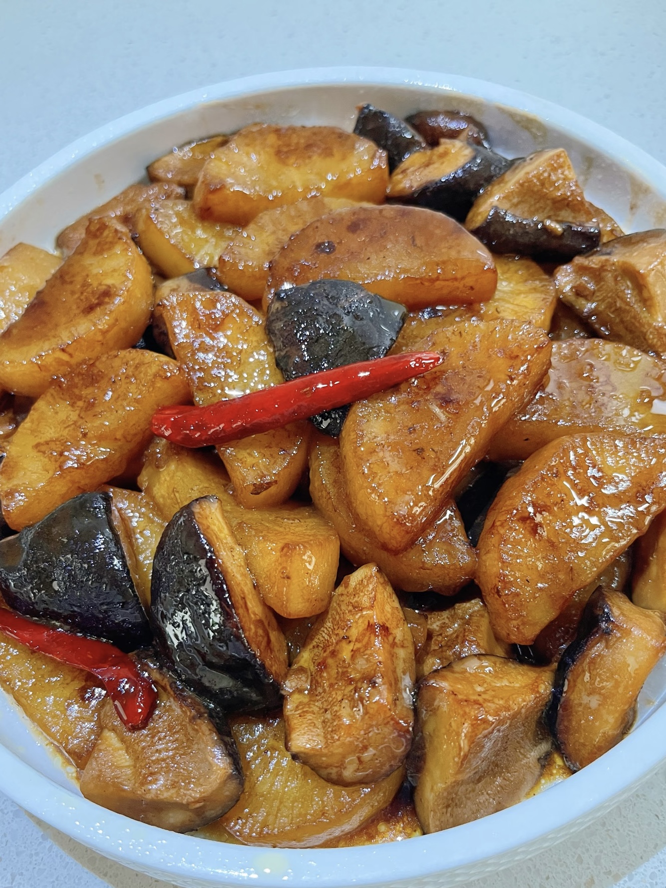 盛一碗米饭,把萝卜和香菇堆成小山,浇两勺汤汁,米粒瞬间裹上琥珀外衣。第一口先吃萝卜,外层绵软、内心微脆,甜汁在舌尖炸开;再咬香菇,肉厚多汁,带着辣椒的轻抚,像素版红烧肉却毫不油腻。三分钟不到,碗底朝天,只剩葱花孤零零,此时才想起拍照——对不起,锅已空。