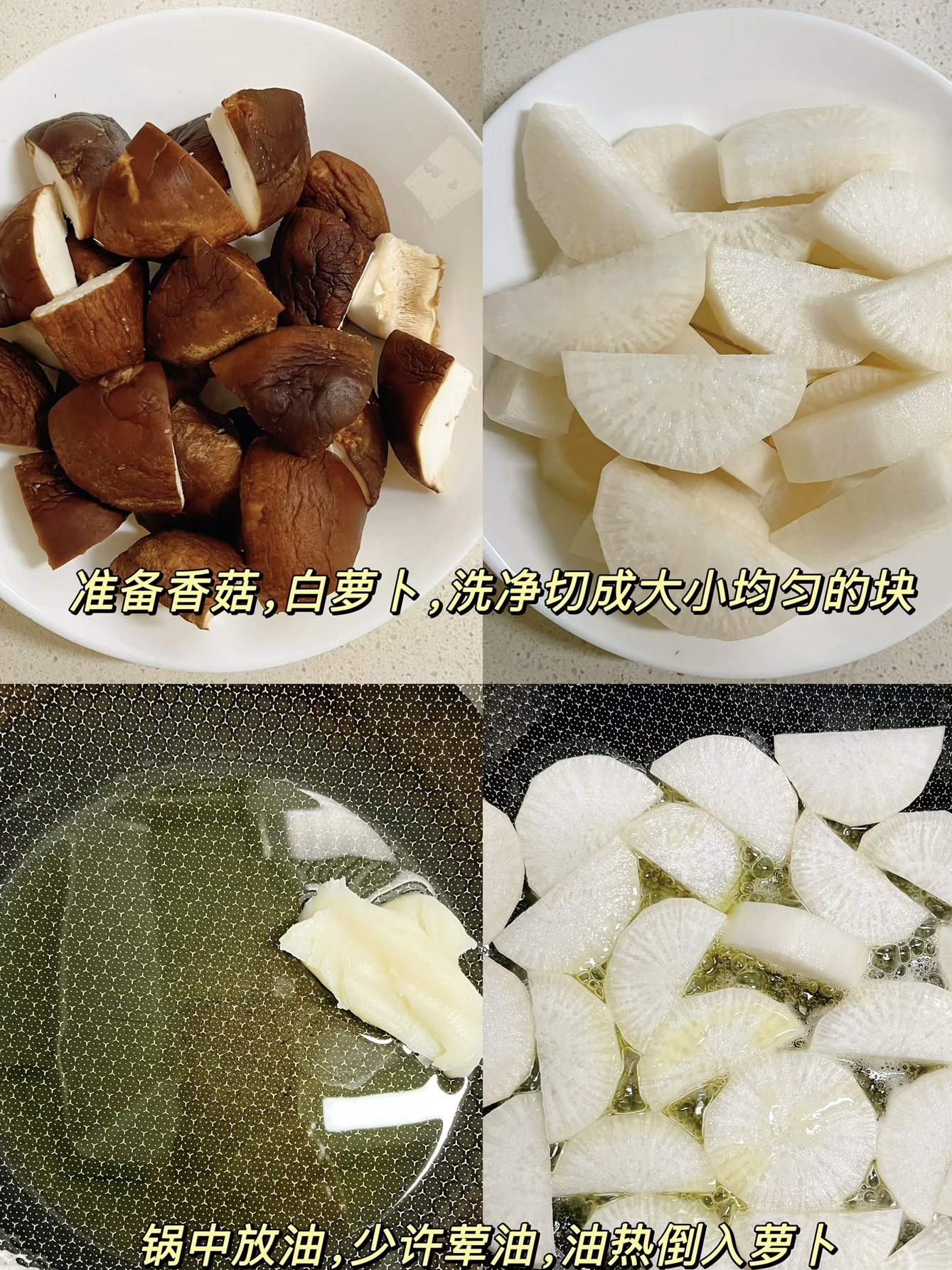 先把舞台搭好:白萝卜半根、鲜香菇六朵、干辣椒两根、姜三片,再抓一把灵魂“十三香”。萝卜切滚刀块,厚度得跟手机壳差不多,太薄炖烂、太厚不入味;香菇去蒂,伞盖划十字,既好看又方便吸汁。关键一步别偷懒——锅里滴两滴荤油(猪油或鸡油),素油立马有了“肉魂”。油温五成热,萝卜块排排坐,中火煎到边缘微焦,像给萝卜穿件焦糖外套,锁鲜又防烂。
