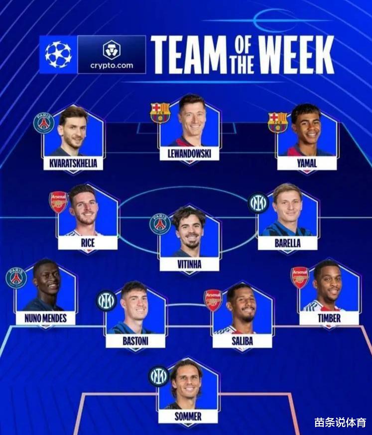 巴萨"新老双枪"莱万(3球1助)与亚马尔(2球2助)携手巴黎边锋K77占据锋线三席,中场则由阿森纳铁腰赖斯领衔。这位英格兰国脚在对阵皇马的比赛中完成12次对抗成功和98%的传球精准度,成功压制莫德里奇。国米门将索默以单场9次扑救零封拜仁的表现当选最佳门将,证明了传统门将的竞技价值。