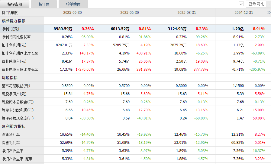 公司2025年第三季度报告中,单季营业收入约2.67亿元,同比增长约2.24%。年初至报告期末累计营业收入约8.41亿元,同比增长约17.37%。归属于上市公司股东净利润约0.90亿元(即0.8981亿元),同比增长约0.26%。扣除非经常性损益后的净利润约0.82亿元,同比增长约2.33%。经营活动现金流量净额约0.89亿元,同比下降约30.54%。总资产约24.01亿元,同比增长约5.31%;所有者权益约16.84亿元,同比增长约2.98%。