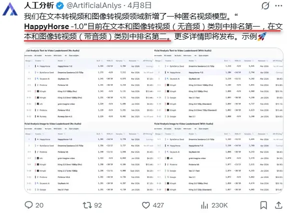 在知名AI评测分析平台Artificial Analysis上,一款代号为「HappyHorse-1.0」的视频生成类模型悄然空降,一来就给大家伙儿整了个大活儿。