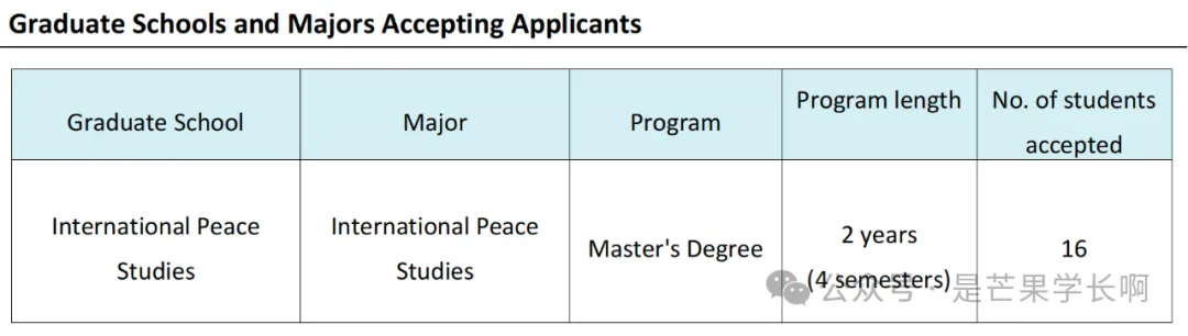 国际平和学研究科开设两门核心课程,即 “国际关系理论 ”和 “和平与全球公民”,每门课程四个学分。该研究科将从提供社会所需的正确价值观的角度出发,培养能够以社会科学的方式分析全球化迅猛发展的当今国际社会问题的人才。核心课程之一 “国际关系理论 ”的重点是作为全球社会基本构成单位的国家。选修这门课程的研究生将学习国际关系理论,将国家间冲突的原因和利益协调机制作为主要研究课题。同时,在 “和平与全球公民”课程中,修士将学习和平研究理论,将社会中的冲突、对抗和争端(包括非国家实体)作为分析主题。无论冲突中的行为者是国家还是非国家,通过解决这些冲突而实现的被称为和平的局面是一个模糊的概念,其定义本身就存在带来不同文化和价值观之间冲突的历史和现实。另一方面,为了控制高度专业化和细分技术的全球化给社会带来的积极和消极影响,在社会和组织方面达成某种共同观点是必不可少的。和平与全球公民意识 "课程旨在找到一种共同观点,以解决全球公民意识概念中充满困境的挑战。因此,该课程将通过让学生学习和平研究理论,培养能够通过与他人的坦诚交流找到价值观共同点的人才。作为必修选修课,“国际平和学研究科 ”开设 “国际关系理论 ”和 “和平研究 ”两个领域的主要课程。通过选修这两个领域的必修课程,学生将获得有关全球化导致的各行为体之间的对抗和冲突的原因、解决这些问题的观点和具体方法的高水平学术智慧。国际关系理论领域的选修课程是一组从外交关系、全球治理、国际政治和经济体系以及欠发达国家发展的角度分析国际冲突的课程。选修这些课程的学生将获得与国际冲突的起因和解决办法有关的历史、制度和技术方面的学术智慧,并获得专业知识,使他们能够在国际组织、行政机构或非政府组织(NGOs)广泛从事与解决冲突和冲突后重建有关的高技能职业。和平研究领域的选修课程将从关注各种社会冲突和非国家实体之间对抗的角度出发,涵盖冲突解决、人类安全、人权和性别等主题的一系列课程。通过这些课程的学习,学生将广泛了解与解决社会冲突相关的思想和制度的演变,从而获得在国内外企业、行政部门和非政府组织中制定切实可行的具体政策和措施的技能,以解决由各种利益冲突引发的社会问题。