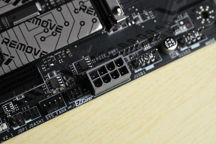 主板底部的8pin电源接口为PCIe设备提供额外的供电支持。