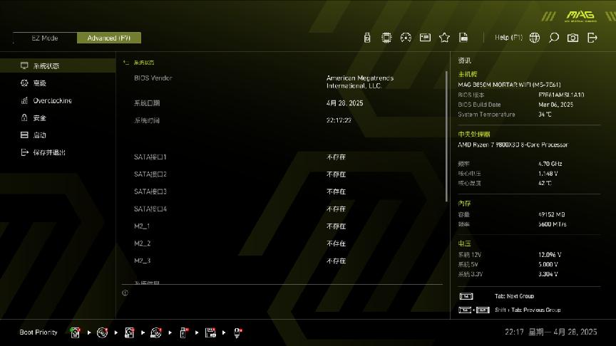 按F7进入高级模式后,可见左侧的分页栏目和右边的详情栏目,最右边的一栏为主板/CPU信息详情页,一般用来查看BIOS版本。