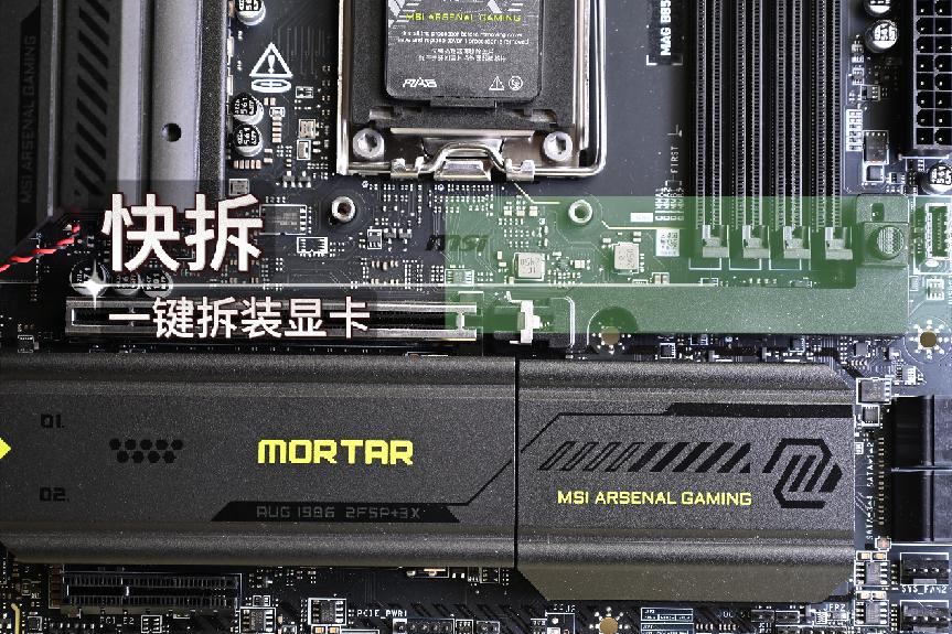 主板第一PCIe X16插槽进行了合金加固处理,有效防止插槽损坏。支持PCIe5.0 X16,也可进行拆分。插槽右侧为一键解锁显卡按钮。