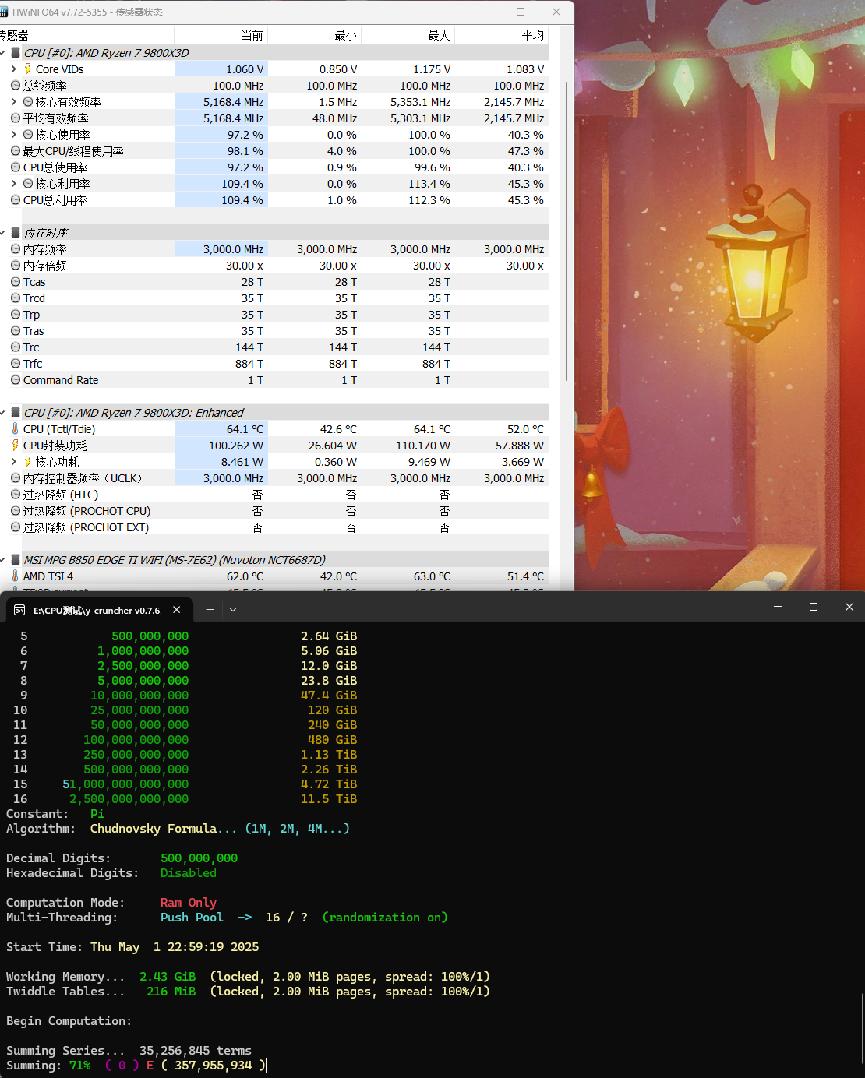 通过y-cruncher在十进制下压榨平台的浮点计算性能,可以得到该平台的真实计算上限,由于该软件在0.7.3后会调用AVX512指令集,所以在计算时CPU会全负荷运行。我在测试了5亿位后Π计算量,得到的计算时间仅为10秒,在极端压力下9800X3D工作峰值功耗为110W,这点压力对于微星MAG B850M MORTAR WIFI迫击炮的供电来说几乎等于没有压力。