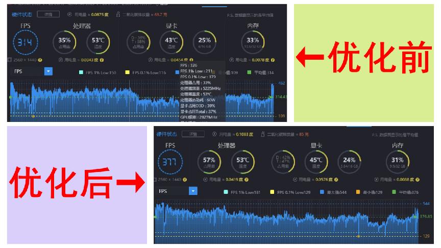 网游《守望先锋》快速匹配+固定奶位,优化前平均帧568,1% low 帧310,优化后平均帧597,1% low 帧365,提升了17%。